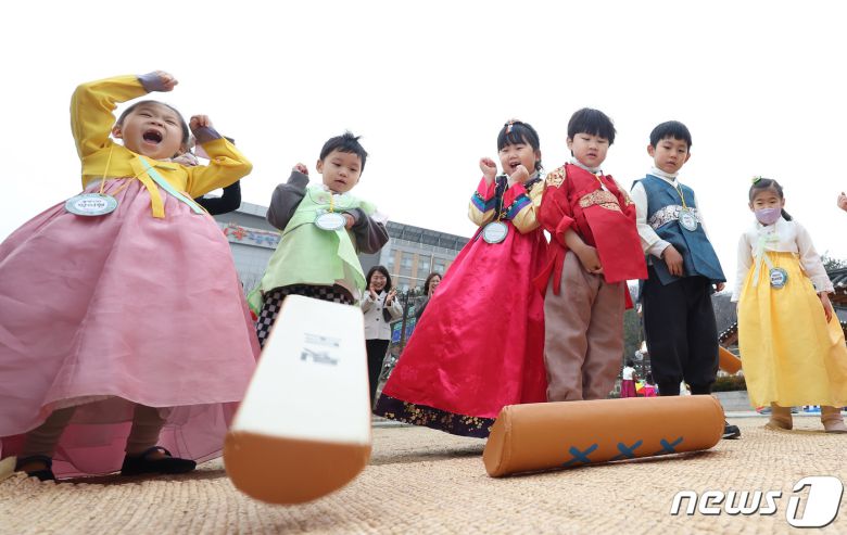 설 연휴를 앞둔 7일 오전 서울 강남구 못골한옥어린이도서관에서 열린 서당에서 만나는 설날 전통놀이 행사에서 어린이들이 윷놀이를 하며 즐거운 시간을 보내고 있다. 2024.2.7/뉴스1 ⓒ News1 김민지 기자