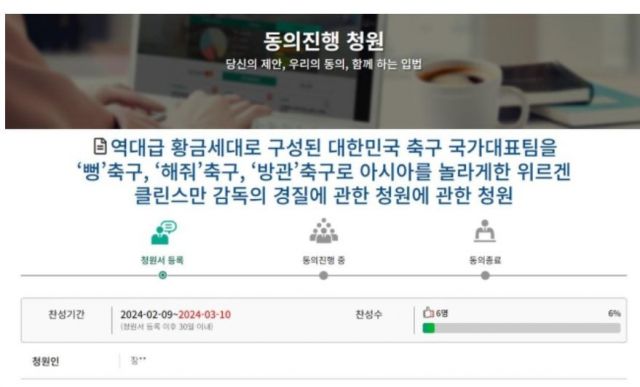 국회 국민동의청원 사이트에는 9일 ‘역대급 황금세대로 구성된 대한민국 축구 국가대표팀을 ‘뻥 축구’, ‘해줘 축구’, ‘방관 축구’로 아시아를 놀라게 한 클린스만 감독의 경질에 관한 청원’이라는 제목의 청원서가 올라왔다.
