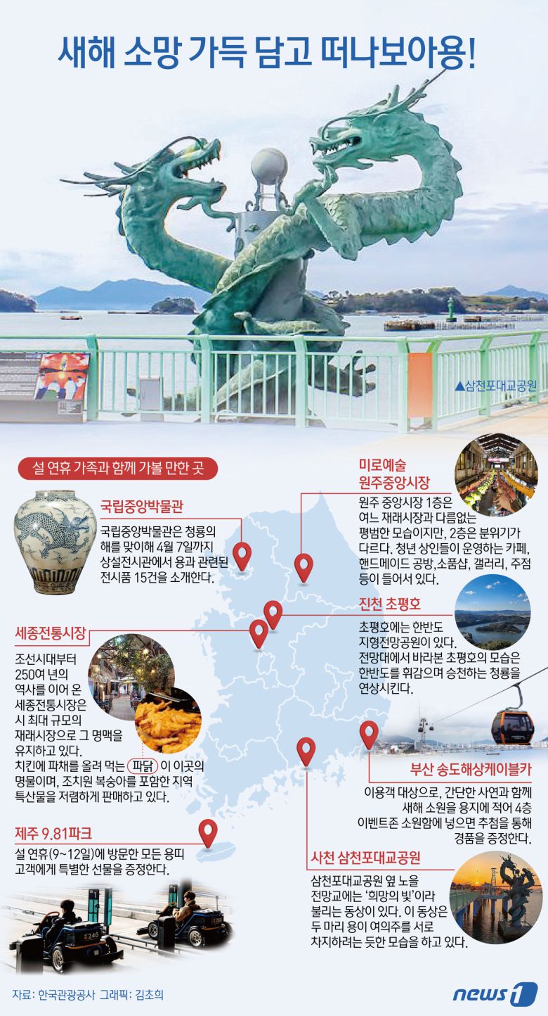 (서울=뉴스1) 김초희 디자이너 = 한국관광공사가 운영하는 '대한민국 구석구석' 누리집에서 설 연휴 가족과 함께 가볼 만한 곳을 선정했다. 국립중앙박물관에서 청룡의 해를 맞이해 4월 7일까지 상설전시관에서 용과 관련된 전시품 15건을 소개한다고 전했다. 이밖에 미로예술 원주중앙시장, 진천 초평호, 세종전통시장, 부산 송도 해상케이블카, 사천 삼천포대교공원, 제주 9.18파크 등에서 연휴를 만끽하기 좋은 곳으로 추천했다.