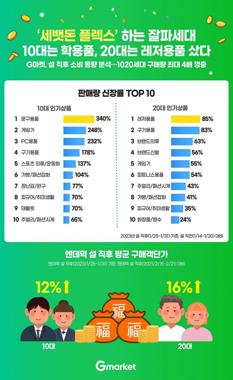 G마켓 관계자는 "통상 설 연휴 직후는 세뱃돈을 활용한 소비에 신학기 준비 수요가 맞물리며 1020세대의 구매가 증가하는 시기인데, 지난해에는 엔데믹 여파로 그 증가폭이 이전보다 더욱 컸다"며 "올해도 비슷한 추세가 이어질 것으로 보여 2월 말까지 잘파세대를 위한 다양한 프로모션을 선보일 예정"이라고 설명했다.