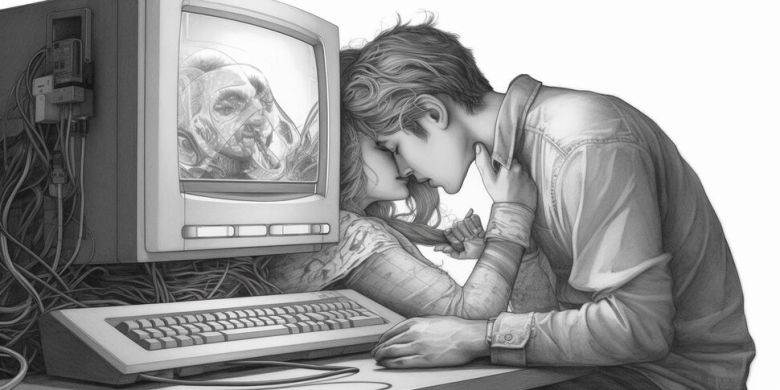 1960년대 미국 매사추세츠공대(MIT)에서 인간이 인공지능 일라이자에 깊은 애착을 느낀 사례를 소재로 미드저니(그래픽 인공지능)가 산출한 그림.