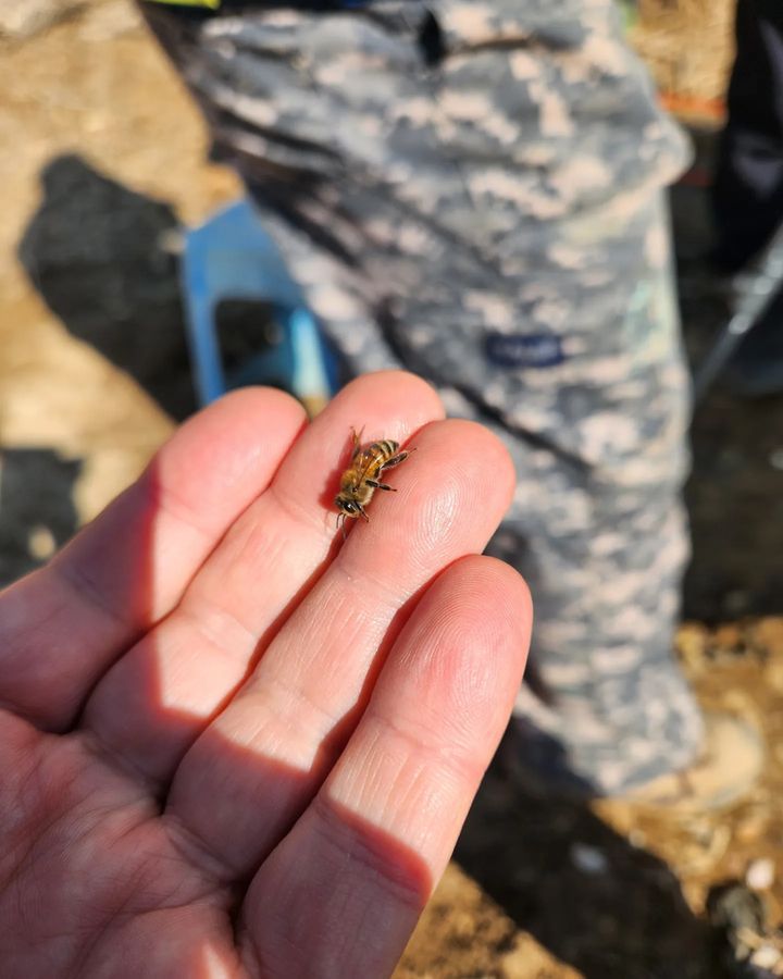 사진 속 동공이 안 보일 정도로 눈이 부었는데도 환하게 웃고 있는 윤택은 손에 놓인 꿀벌 한 마리 사진도 공개했다.