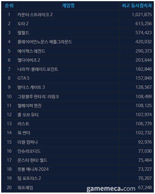 일 최고 동시접속자 TOP 20에서는 팰월드가 급격한 하락세를 타며 50만 대에 접어들었다. 지난 8일 출시된 신작 헬다이버즈 2는 20만 3,644명으로, 6위에 올랐다.