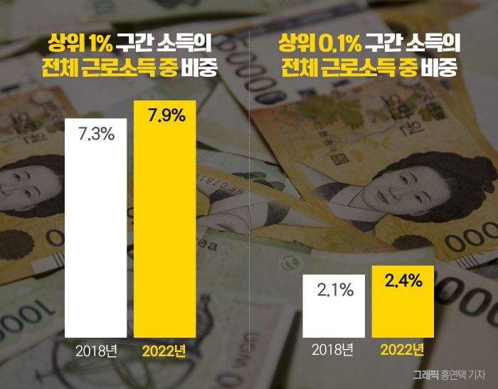 2022년 상위 0.1% 구간 소득이 전체 근로소득에서 차지하는 비중은 2.4%로 2018년 2.1%보다 0.3%p 상승했고, 상위 1% 구간 소득 비중 역시 같은 기간 7.3%에서 7.9%로 커진 것이지요.