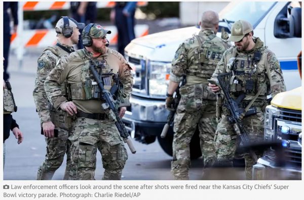 캔자스시티 치프스의 슈퍼볼 승리 퍼레이드 근처에서 총격이 발생한 후 법 집행관들이 현장을 둘러보고 있다. /가디언지 갈무리 |