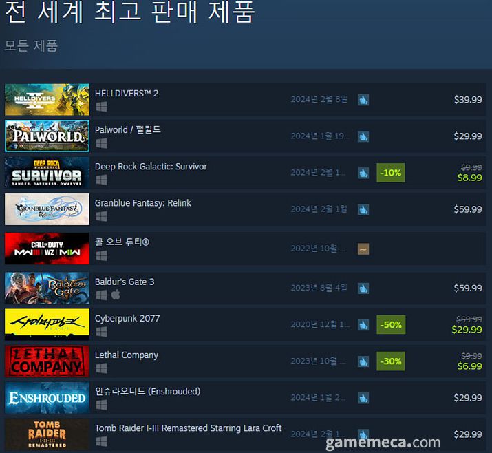 ▲ 2월 15일 오후 1시 기준 스팀 전세계 최고 판매 제품 TOP 10 (자료 출처: 스팀) |