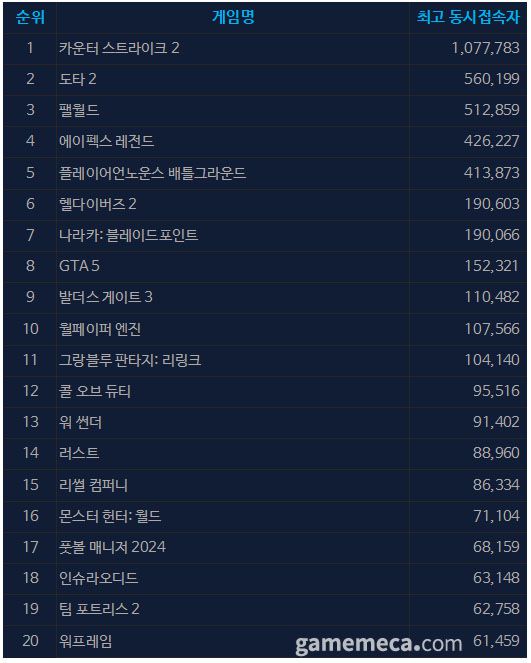 일 최고 동시접속자 TOP 20에서는 신규 시즌을 시작한 에이펙스 레전드가 전일 대비 13만 명 증가한 42만 6,227명으로 4위에 올랐다. 헬다이버즈 2는 19만 603명으로 다소 주춤했고, 인슈라오디드는 6만 3,148명으로 감소해 18위로 내려갔다.