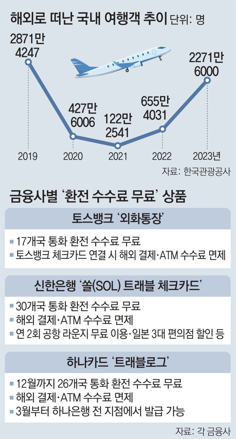 신종 코로나바이러스 감염증(코로나19) 엔데믹으로 지난해부터 해외여행객이 급증하면서 이들을 잡기 위한 금융사들의 경쟁이 치열해지고 있다. 특히 올해 들어 인터넷전문은행인 토스뱅크에 이어 신한은행까지 ‘환전 수수료 무료’ 혜택을 내세운 외환 서비스 상품들을 앞다퉈 출시하고 있다.