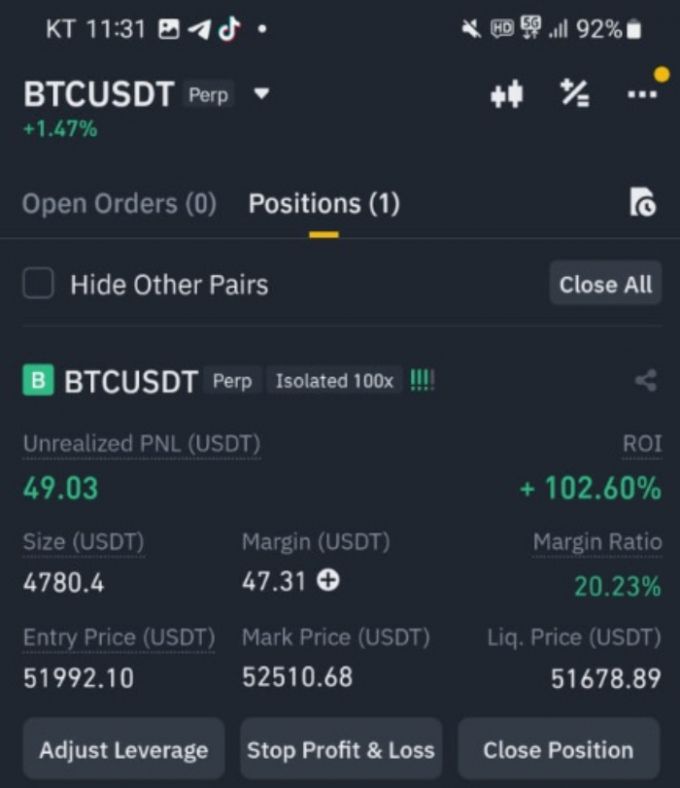 15일 저녁 6시2분 바이낸스 코인 선물시장에서 증거금(margin) 47USDT(1USDT=1달러)를 걸고 100배 고배율 레버리지로 비트코인에 롱(매수) 포지션을 취한 결과 밤 11시31분 투자수익률(ROI) 102.6%(를 기록하며 49USDT의 이익이 발생하고 있다. |