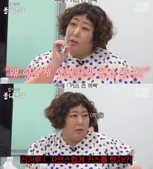 이후 신기루는 호텔로 갔고, 그는 "소주 한잔하다가 오빠가 '왜 이렇게 섹시하게 입고 왔어' 하더라"며 "듣는 척도 안 하고 있었는데 '먹을래?' 하더라. 내가 감자탕 못 바른다고 했더니 살점을 발라서 먹여주다가 자연스럽게 키스를 했다"며 남다른 첫키스 에피소드를 공개했다.