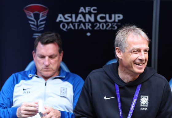 아시안컵에서 벤치에 나란히 앉은 위르겐 클린스만 감독(오른쪽)과 헤어초크 수석 코치. [연합뉴스] |