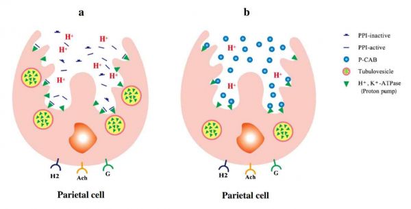 대웅제약에 따르면 P-CAB 제제는 위산 분비 최종 단계에 작용하는 프로톤 펌프(H+, K+-ATPase)라는 효소와 칼륨이온(K+)이 가역적으로 결합해 강력하게 위산 분비를 억제하는 효능을 가졌다. 위산에 의해 활성화된 후에야 프로톤 펌프와 비가역적으로 결합하는 PPI와는 기전이 완전히 다른 구조의 약물로 PPI와 상대적으로 비교했을 때 약효가 빠르고 오래 지속되며, 야간 산 분비 조절에 효과적이고, 식사 여부와 관계없이 편하게 복용할 수 있다고 한다.