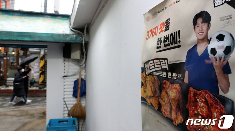 (서울=뉴스1) 이승배 기자 = 한국 축구 국가대표팀 이강인 선수(파리 생제르맹 FC)가 대표팀 내 하극상 논란에 휩싸이면서 이강인 선수를 광고 모델로 쓴 기업들이 곤욕을 치르고 있다. 19일 유통업계에 따르면 한 치킨 프랜차이즈 업체는 최근 공식 홈페이지에서 이강인의 광고 영상을 모두 지웠다. 업체는 별도 재계약은 하지 않을 예정인 것으로 알려졌다. 19일 서울 시내의 한 이강인 선수를 광고 모델로 쓴 치킨 프랜차이즈 지점에 광고 포스터가 붙어있다. 2024.2.19/뉴스1