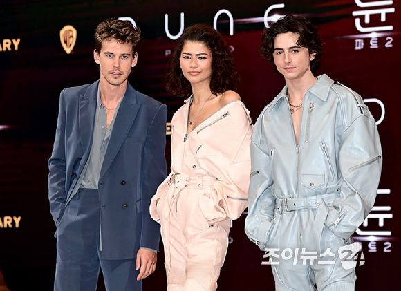 [조이뉴스24 곽영래 기자]배우 오스틴 버틀러, 젠데이아 콜먼, 티모시 샬라메가 21일 오후 서울 여의도 콘래드서울호텔에서 열린 영화 '듄: 파트2(드니 빌뇌브 감독)' 내한 프레스 컨퍼런스에서 기념촬영을 하고 있다.
