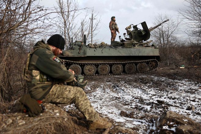 20일(현지시간) 우크라이나군 대공포 병력이 도네츠크 바흐무트 방향을 주시하고 있다. / AFP 연합뉴스