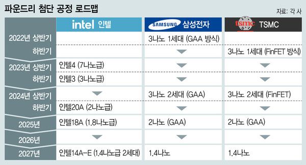 반도체 위탁생산(파운드리) 후발주자인 인텔이 업계 1, 2위인 티에스엠시(TSMC), 삼성전자보다 먼저 1.4나노(인텔14A) 공정을 도입하겠다고 밝히면서 1나노 경쟁에 불을 지폈다. 반도체 칩 제조와 별도로 패키징과 테스트 만을 따로 할 수 있는 서비스를 만들어 2030년까지 업계 2위인 삼성전자를 제치겠다는 공언도 내놨다. 파운드리 사업에 재진출한 인텔의 승부수가 1400억달러에 이르는 전세계 파운드리 시장을 뒤흔들지 주목된다.