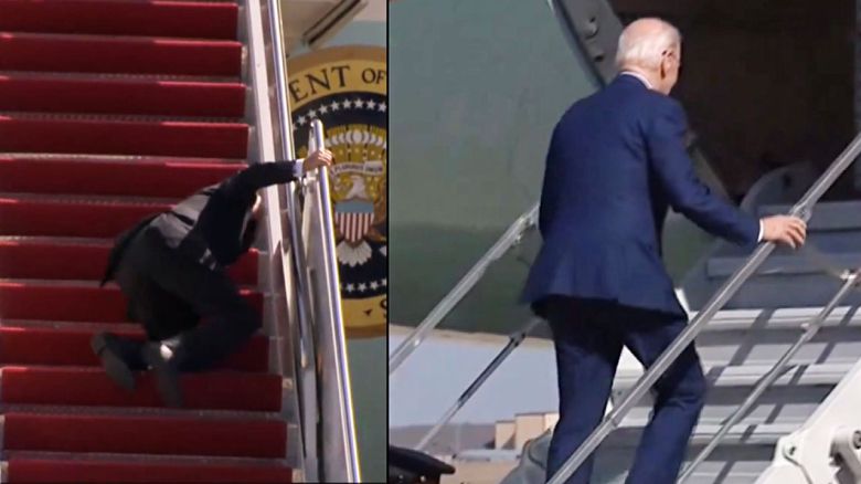 이 영상을 소셜미디어에 올린 공화당 전국위원회는 일부러 짧은 계단을 이용했는데도 두번이나 넘어질 뻔했다고 했습니다.