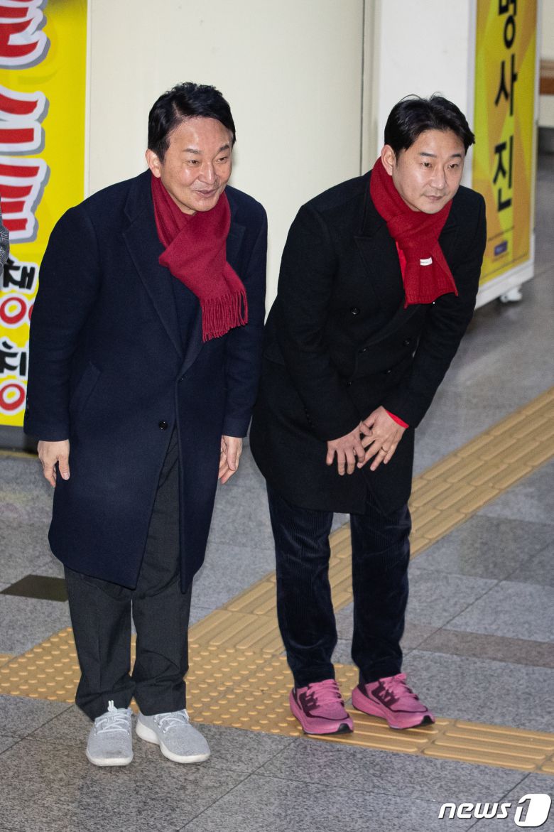 (인천=뉴스1) 유승관 기자 = 제22대 국회의원 선거 인천 계양(을) 지역에 출마한 원희룡 전 국토교통부 장관과 전 축구 국가대표 이천수가 22일 인천 계산역 내에서 출근길 시민들에게 인사하고 있다. 이천수는 이재명 더불어민주당 대표 지역구인 인천 계양을에 출마한 원희룡 국민의힘 후보의 후원회장을 맡아 총선까지 선거운동을 함께 한다. 2024.2.22/뉴스1