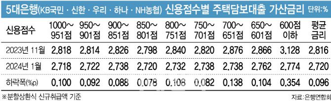 실제 은행연합회에 따르면 1월 5대 은행의 주택담보대출 가산금리 평균은 2.720%로 작년 11월보다 0.096%포인트 하락했다. 900점대 이상 고신용자는 0.100%포인트가량 가산금리가 내려갔다. 그러나 저신용자의 가산금리 하락폭은 더 크다. 651~700점대는 0.138%포인트, 600점 이하는 무려 0.354%포인트나 가산금리가 내렸다. 평균 가산금리 내림폭(0.096%)을 훌쩍 뛰어넘는 수치다.