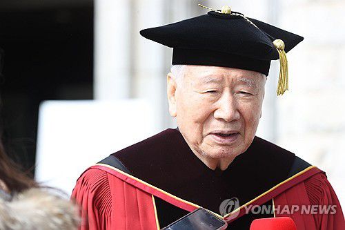 (서울=연합뉴스) 강민지 기자 = 이중근 부영그룹 회장이 23일 오전 서울 성북구 고려대학교에서 열린 '제117회 학위수여식'에서 취재진의 질문에 답하고 있다. 2024.2.23