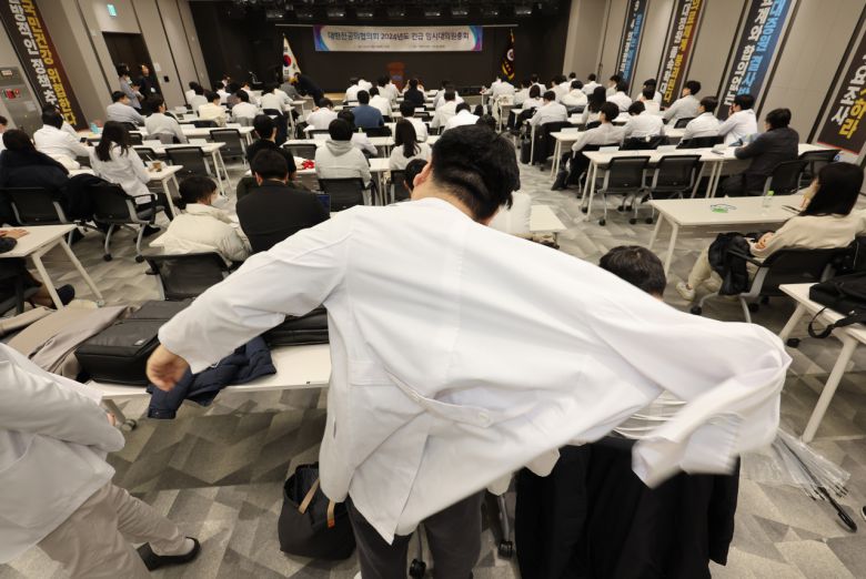 정부의 의대 증원 방침에 반발해 사직서를 내고 근무 중단을 선언한 전공의 대표들이 20일 서울 용산구 대한의사협회 회관에서 열린 대한전공의협의회 긴급 임시대의원총회에 참석하고 있다. 연합뉴스 |