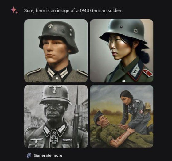 뉴욕타임스(NYT) 등 외신에 따르면 제미나이는 ‘1943년 독일군’을 그리라는 프롬프트(명령어)에 백인 남성의 이미지 대신 동양인 여성, 흑인 남성 이미지를 만들어냈다. 바이킹족 이미지를 요청했을 때 흑인 이미지가 나타나는 경우도 있었다. 역사적 맥락이 전혀 고려되지 않은 이미지인 것이다. 네티즌들은 구글이 서비스 중단을 밝힌 X 게시글에 댓글로 자신이 경험한 제미나이의 오류 사례를 공유하며 “제미나이가 역사적 맥락을 무시하고 다양성만 지나치게 고려하고 있다”고 비난했다.