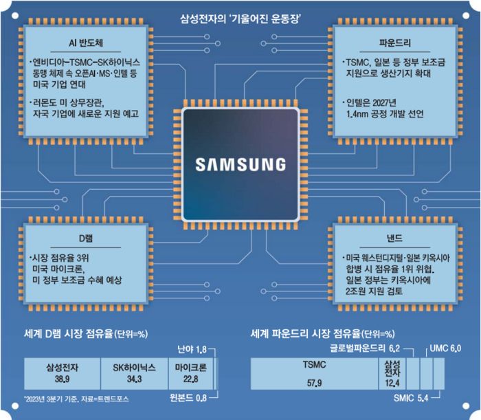 반도체 산업을 주도하는 주요국들의 보조금 경쟁과 자국기업 선호 분위기가 고조되는 가운데 삼성전자는 인공지능(AI) 반도체·파운드리·D램·낸드 등 전 부문에서 ‘기울어진 운동장’에 선 상태다. 연초 대비 주가 상승폭이 엔비디아 58.6%, TSMC 17.5%, 도쿄일렉트론 44.8%, AMD 23.4% 에 달하지만 삼성전자는 -7.1% 하락한 것은 이같은 위협이 반영된 결과라는 게 재계 시각이다.