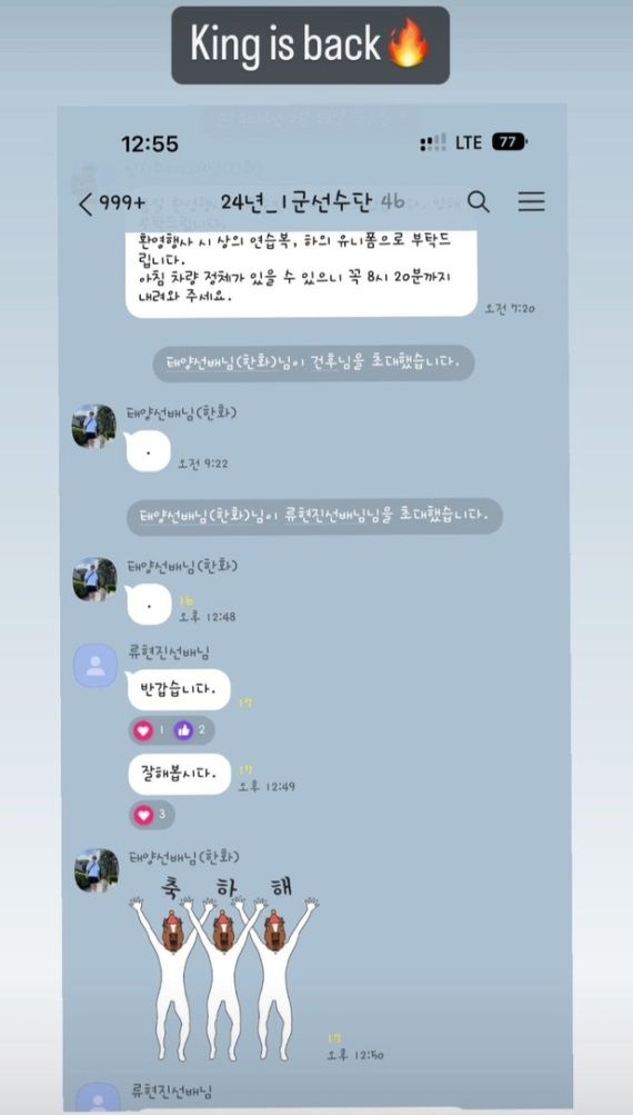 고친다 구장에서 만난 이태양에게 단체방 이야기를 물었다. 이태양은 "내가 선수단 매니저도 아닌데 (장)민재가 내게 연락을 했더라(웃음). 초대하자고 하기에 바로 초대했다"며 "(류현진에게 보낸) 이모티콘은 몇 년 전에 구매한 것이다. 장난삼아 '축하해'라고 보냈다. 형을 무척 좋아해서 그랬다"고 설명했다.