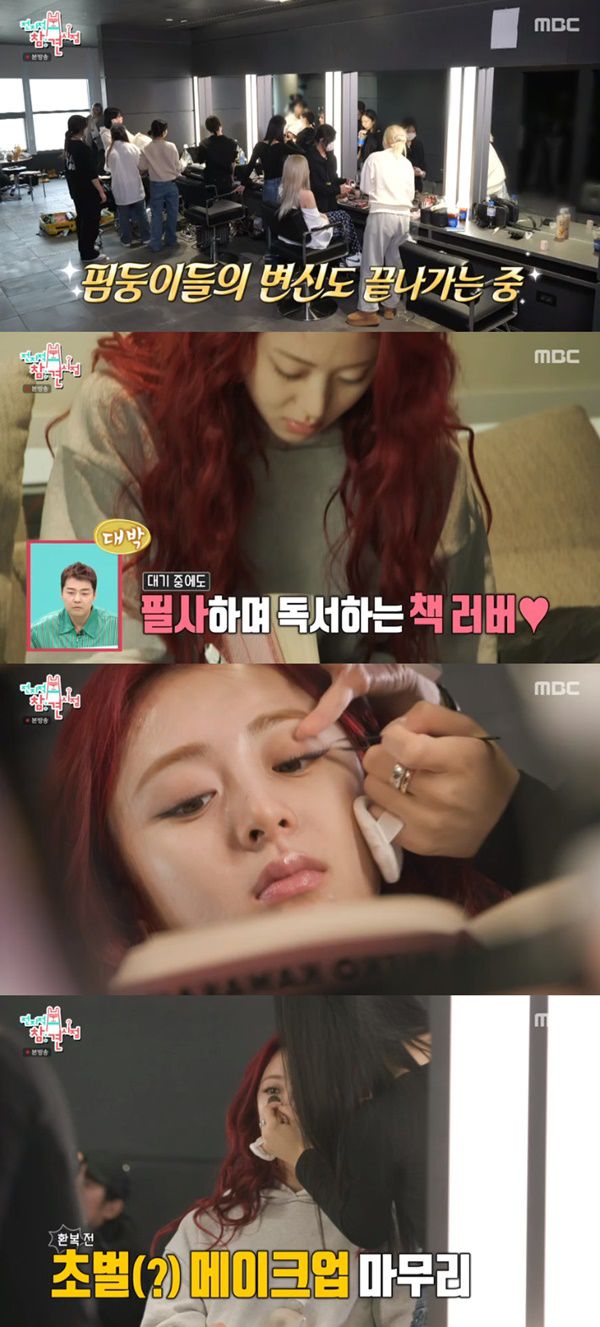 르세라핌 윤진은 메이크업을 받으면서도 책에 빠진 모습에 놀라움을 자아냈다.