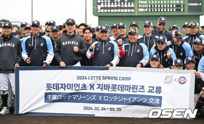 [OSEN=오키나와(일본), 조은정 기자]25일 일본 오키나와 니시자키 야구장에서 롯데 자이언츠와 일본프로야구 구단 지바 롯데 마린즈의 친선전이 열렸다. 이날 롯데 지바가 롯데 자이언츠를 상대로 8-1 승리를 거뒀다. 경기 종료 후 지바 롯데 요시이 마사토 감독-롯데 자이언츠 김태형 감독을 비롯한 양팀 선수단이 기념촬영을 하고 있다. 2024.02.25 /cej@osen.co.kr 이 기사의 카테고리는 언론사의 분류를 따릅니다.0공유하기