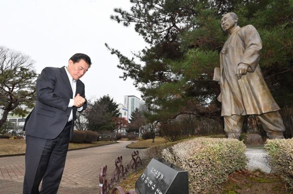 이재준 수원시장이 삼일절을 앞두고 임면수 선생 동상을 찾아 묵념하고 있다. 수원시 제공