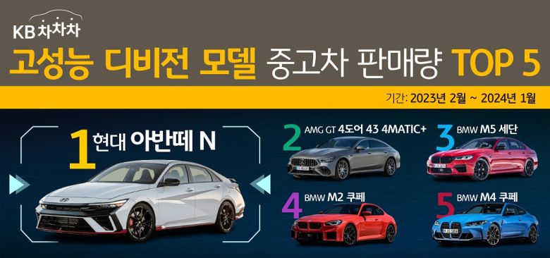이번 분석은 KB차차차에서 2023년 2월부터 2024년 1월까지 최근 1년간 강력한 성능을 자랑하는 고성능 디비전 모델의 중고차 판매량 데이터를 분석해 순위를 산출했으며, 판매 시세와 조회수를 추가로 살펴봤다.