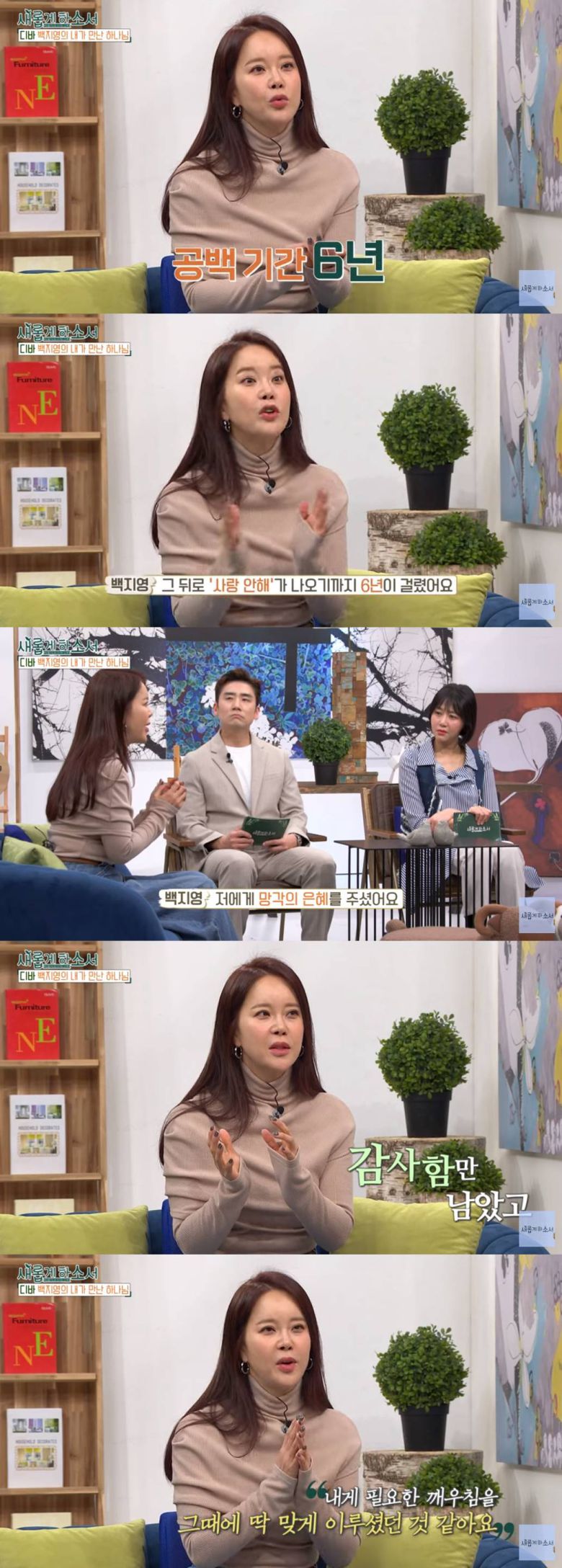 백지영은 그럼에도 "그때가 아니면 안됐다"며 "깨우치라고 주시는 고난을 그 이후에 받았으면 못 일어났을 거라는 생각이 든다. 가족들도 같이 감내했어야 하는 일이었는데 가족도 쉬어야 하는 시기가 겹친거다"라고 설명했다.