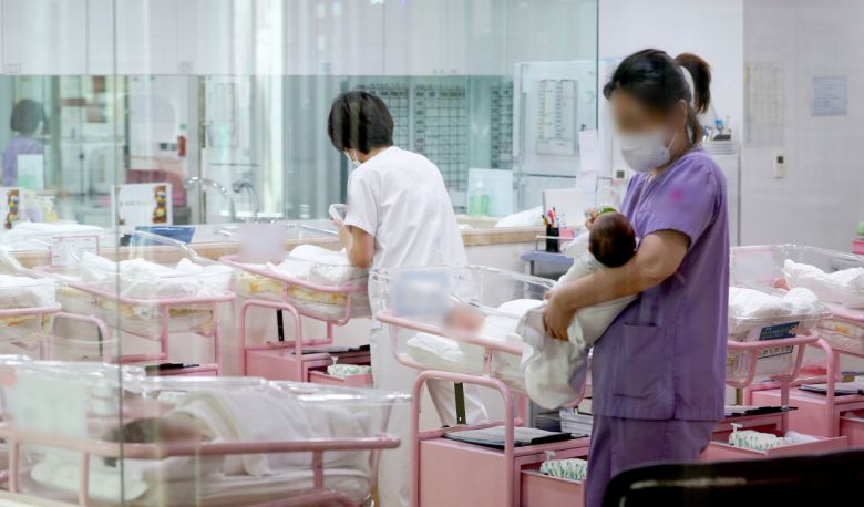 분기 출산율이 처음으로 0.6명대로 떨어지며 저출산 현상이 이어지고 있는 가운데 28일 오후 서울 시내 한 산후조리원 신생아실에서 간호사 등 관계자들이 신생아들을 돌보고 있다. 통계청 '2023년 출생·사망 통계'와 '2023년 12월 인구동향'에 따르면 지난해 출생아 수는 약 23만 명으로 전년(24만9200명)보다 1만9200명(7.7%) 줄어들며 전년에 이어 또 역대 최저를 기록했다. 작년 4분기 합계출산율은 0.65명으로 사상 처음으로 0.6명대까지 떨어졌다. |