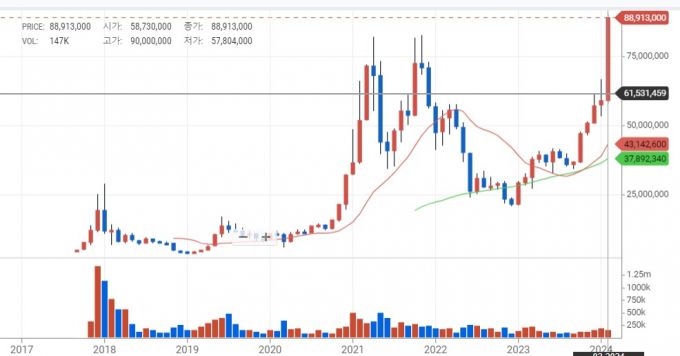 업비트에서 비트코인은 2021년11월 신고가인 8270만원까지 오른 뒤 2022년12월 2000만원대까지 떨어졌다. 그 이후 차츰 반등하기 시작해 2023년10월부터 본격적으로 올랐다. 특히 이달 5873만원으로 시작해 50% 넘는 상승세를 보였다.