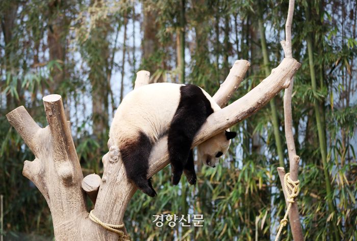 지난달 15일 경기 용인시 에버랜드 판다월드에서 ‘푸바오’가 나무에 매달려 잠을 자고 있다. 서성일 선임기자 |