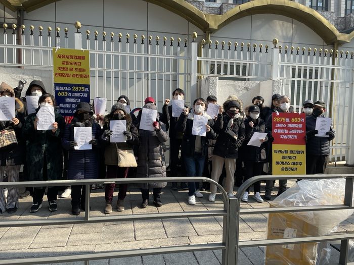 31일 고파이에 자금이 묶인 고팍스 채권단은 금융위원회가 있는 정부서울청사 앞에서 금융당국에 바이낸스의 고팍스 인수 승인을 촉구하고 있다. |