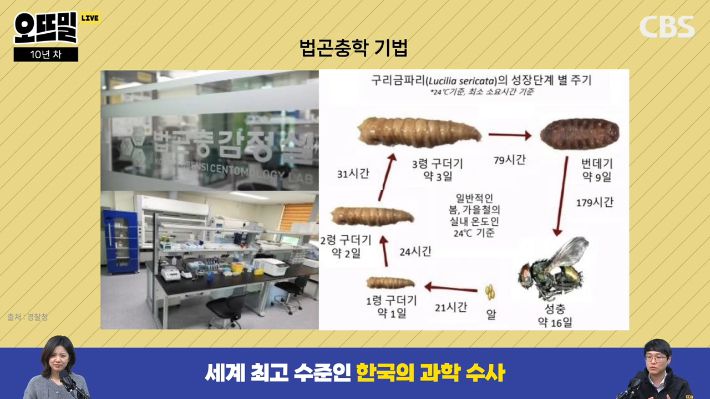 또 법곤충 기법이라고 사후 경과 시간을 추정하는 데 사용되는 기법인데요. 사람이 사망을 하게 되면 시신을 먹는 시식성 곤충들이 날아와서 알을 낳습니다. 그런데 이 곤충들이 신기하게 특정한 온도에서 자라나는 데 걸리는 시간이 어느 정도 정해져 있거든요. 그래서 현장의 온도를 역산해서 곤충이 어느 정도 커졌는지를 분석하면 최소 이 정도 이상은 사망한지 경과했다는 것을 알 수 있는 기법입니다.