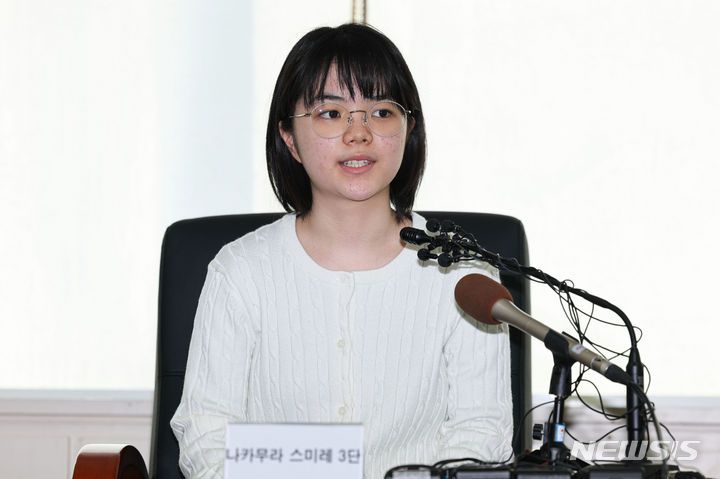 [서울=뉴시스] 권창회 기자 = 나카무라 스미레 3단이 4일 오전 서울 성동구 한국기원에서 열린 입단 기자회견에서 취재진의 질문에 답하고 있다. 스미레는 일본의 바둑 천재 소녀로 10살에 최연소로 입단했다. 일본 프로기사가 한국으로 이적한건 이번이 처음이다. 2024.03.04. kch0523@newsis.com |