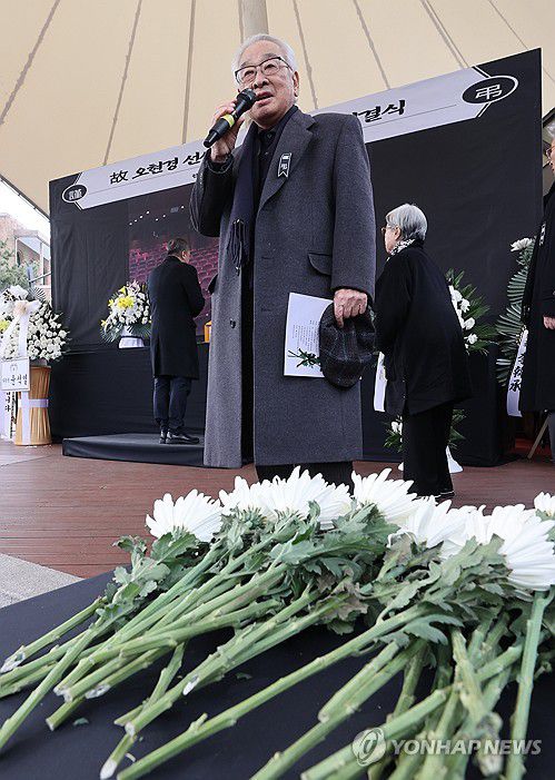 (서울=연합뉴스) 이재희 기자 = 지난 1일 별세한 연극배우 오현경의 연극인장 영결식이 열리고 있는 5일 오전 서울 종로구 마로니에공원에서 배우 이순재가 헌화 후 고인을 추모하고 있다. 2024.3.5