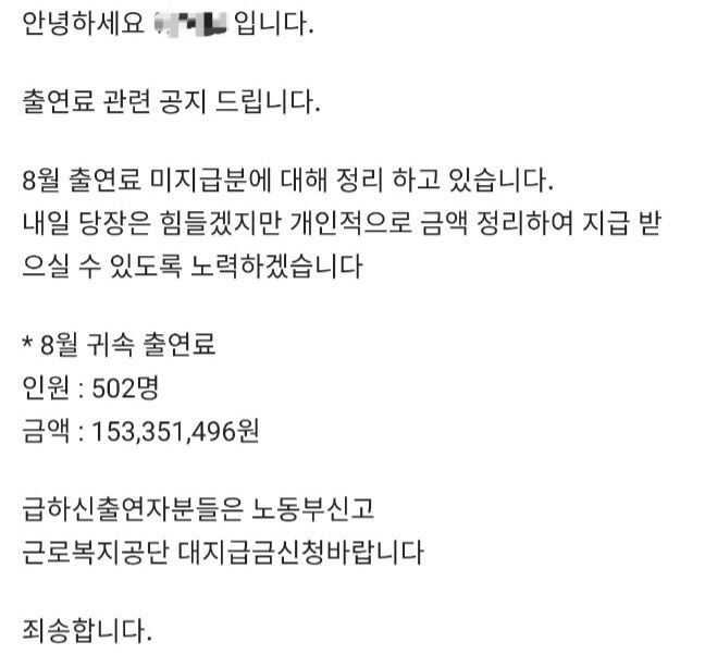 앞서 웨이브 에이전시는 지난해 10월 SNS에 502명의 출연자 몫으로 총 1억5335만원 상당의 출연료를 지급하지 못했다며 "급하신 출연자 분들은 노동부 신고, 근로복지공단 대지급금 신청을 바란다"고 공지한 바 있다.