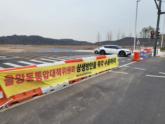 인스파이어 리조트 정문 건너편에 걸린 주변 상인들의 걸개막. 이승욱 기자 |