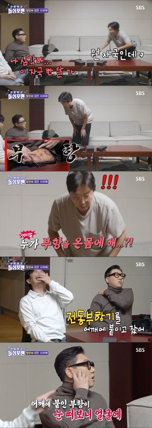 이상민은 “전동부항기를 어깨에 붙이고 잤다. 아침에 일어나니 얼굴로 올라왔다”라고 말해 웃음을 자아냈다. 탁재훈은 “부항 가리려고 메이크업을 떡칠을 한거야?”라고 물었고, 이상민은 맞다며 고개를 끄덕여 웃음을 안겼다.