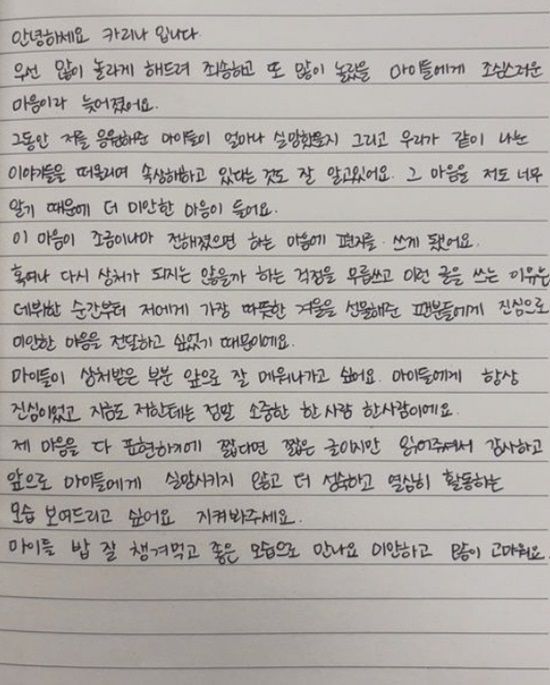 데뷔 4년만에 첫 공개열애를 시작한 에스파 카리나의 후폭풍이 거세다. 결국 5일 장문의 손편지로 진심어린 마음을 담은 사과문을 게재하며 고개를 숙였다.