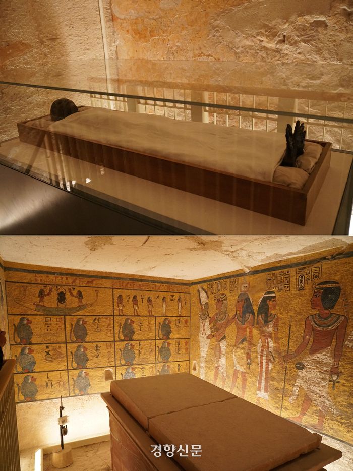 이집트 룩소르의 ‘왕들의 계곡’에 있는 고대 이집트 신왕국시대(기원전 1500~1069년 경)의 파라오 투탕카멘 무덤 속의 투탕카멘 미라(위)와 관이 놓여 있는 널방(현실). 대부분의 미라들이 도굴·약탈로 무덤을 떠나있지만 투탕카멘 미라는 무덤 속에서 관람객을 맞는다. 도재기 선임기자