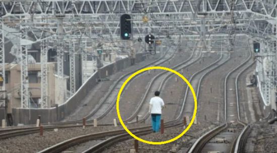 츄오 쾌속선 코엔지역에서 한 남성이 철도 레일을 거슬러 올라가는 모습. [사진=온라인 커뮤니티 갈무리] |