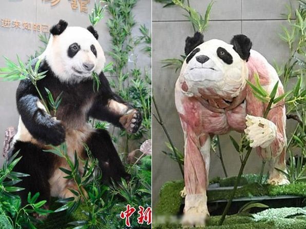 푸바오의 외할머니 판다 신니얼이 죽은 뒤 박제 상태로 전시돼 있는 모습. 외형·근육·내장·뼈 표본이 관람객들을 맞고 있다. /웨이보 |