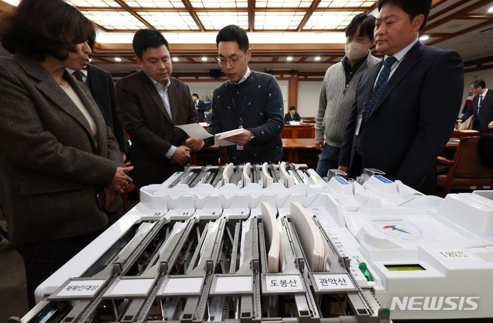 [과천=뉴시스] 고승민 기자 = 6일 경기 과천시 중앙선거관리위원회에서 열린 제22대 국회의원선거 선거장비 보안자문위원회의에서 선관위의 투표지분류기가 시연되고 있다. 2024.03.06. kkssmm99@newsis.com |