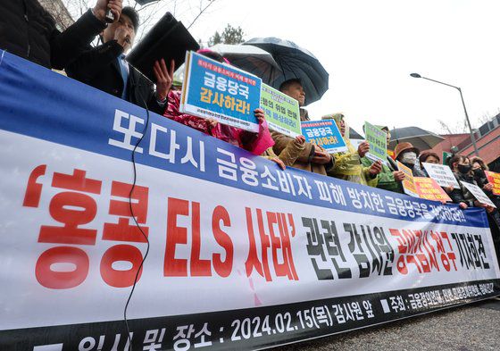 금융정의연대, 민변 민생경제위원회, 참여연대 활동가들이 지난달 서울 종로구 감사원 앞에서 '홍콩 ELS 사태' 관련 감사원 공익감사 청구 기자회견을 하고 있다. 뉴스1