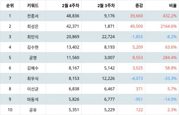 최성은은 42,371포인트로 전주보다 40,500포인트 상승해 2위를 차지했다.